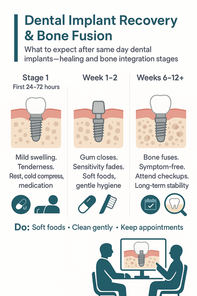 Recovery after same day dental implants focuses on healing and a biologic process called osseointegration, where the implant bonds with your jawbone. While teeth may look complete quickly, the bone continues to strengthen around the implant over several months.