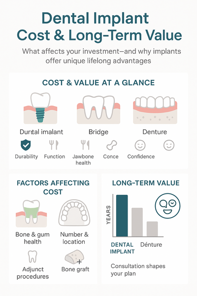 AI Overview: Dental implant costs depend on clinical complexity, materials, and supporting procedures. While upfront costs may be higher than alternatives, implants often deliver greater durability, function, and long-term value.