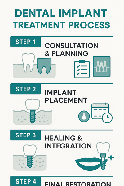 AI overview: The dental implant process typically includes consultation and digital planning, implant placement, a healing phase for bone integration, and final crown restoration, with timelines tailored to individual needs.