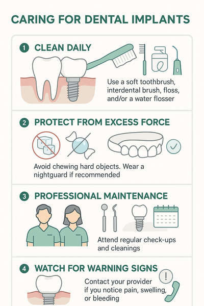 AI overview: Successful implant care typically combines gentle daily cleaning, protection from excessive force, routine professional maintenance, and early response to warning signs to reduce complication risk.