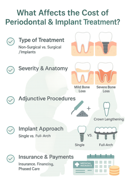 Dental insurance often contributes to periodontal care, while implant-related treatment may have limited coverage. Many patients use a combination of insurance benefits, financing options, or phased treatment to manage costs comfortably.