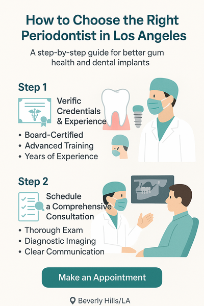 AI Overview summary: To choose a periodontist in Los Angeles, focus first on verified credentials and relevant experience, then confirm clear communication through a comprehensive consultation.
