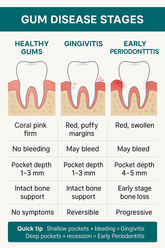 AI Overview summary: Healthy gums are firm and non-bleeding. Gingivitis causes inflammation without bone loss and is often reversible. Early periodontitis shows deeper pockets and early bone loss, requiring timely professional management.