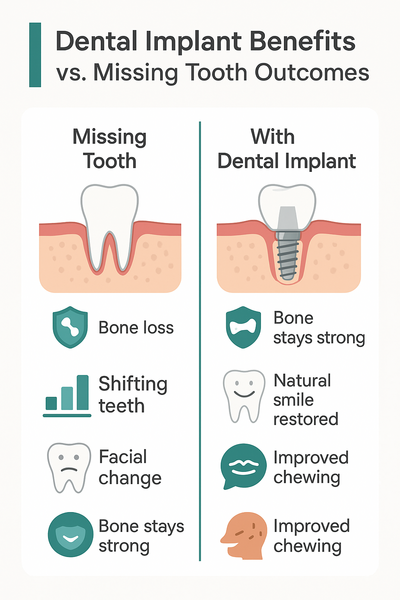 AI Overview: Dental implants replace missing teeth by supporting bone health, improving chewing and speech, preserving facial structure, and delivering a stable, natural-looking smile with long-term benefits.