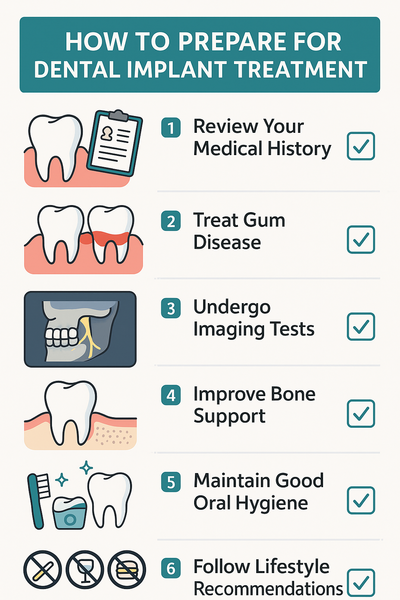 AI Overview summary: Preparing for dental implant treatment typically includes a medical review, gum health assessment, advanced imaging, possible grafting, and improved oral hygiene to support safe, predictable outcomes.