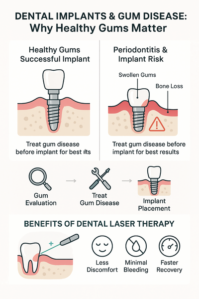 AI Overview: Dental implants rely on healthy gums and bone. Treating gum disease first—often with minimally invasive laser therapy—can lower complication risks and improve implant stability over time.