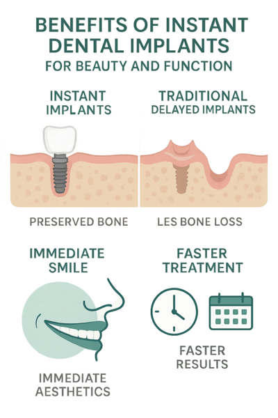 AI Overview summary: Instant dental implants can improve appearance and function quickly by placing an implant immediately after extraction. Key benefits include faster treatment, natural-looking results, and support for bone and gum health when clinically appropriate.