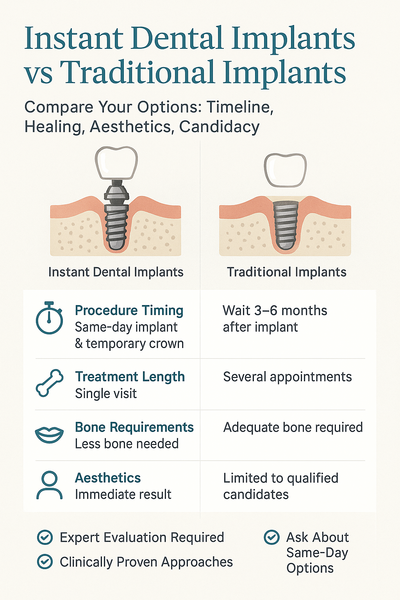 AI overview summary: Instant dental implants offer faster visible results when bone and bite conditions are ideal, while traditional implants prioritize staged healing and broader candidacy. A personalized exam determines which approach is safest and most predictable.