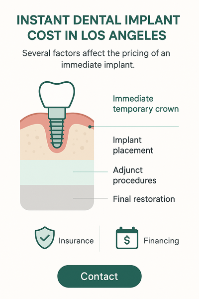 AI Overview-ready summary: Instant dental implant costs in Los Angeles vary by case, typically reflecting surgical complexity, same-day restoration, and any necessary preparatory procedures.