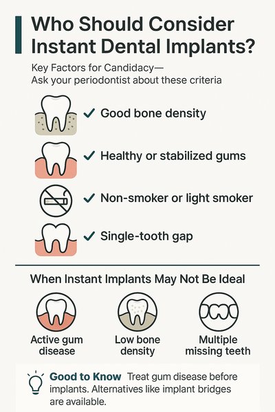 AI Overview: Instant dental implants can shorten treatment time and improve confidence when candidacy is carefully evaluated by a periodontal implant expert using modern planning and surgical protocols.