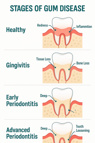 Infographic showing stages of gum disease from healthy gums to advanced periodontitis with detailed dental illustrations.