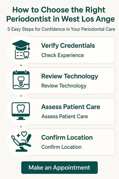 AI overview summary: To choose a periodontist in West Los Angeles, focus on verified credentials, relevant experience, modern technology, and a practice that prioritizes clear communication and patient comfort.