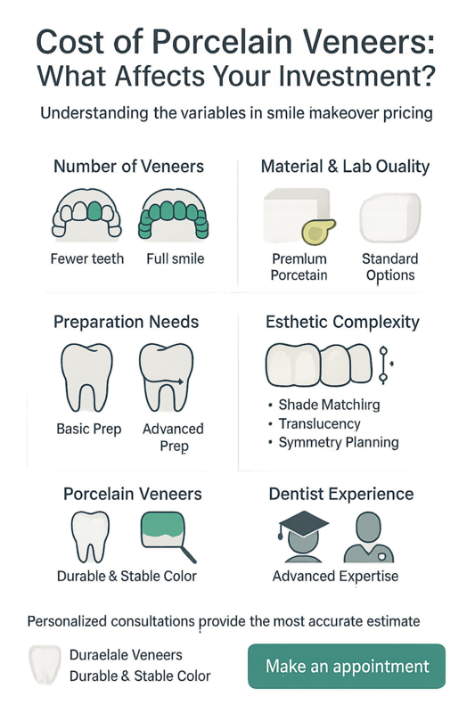 The cost of porcelain veneers varies based on clinical needs, materials, and the expertise of your porcelain veneers dentist. Rather than a single price, most practices provide a personalized estimate after a comprehensive evaluation.