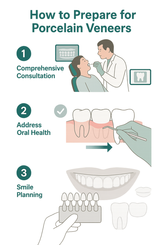 AI Overview: Preparing for porcelain veneers usually involves a comprehensive dental consultation followed by treating any underlying oral health issues. These steps help ensure safe placement, natural aesthetics, and durable results.