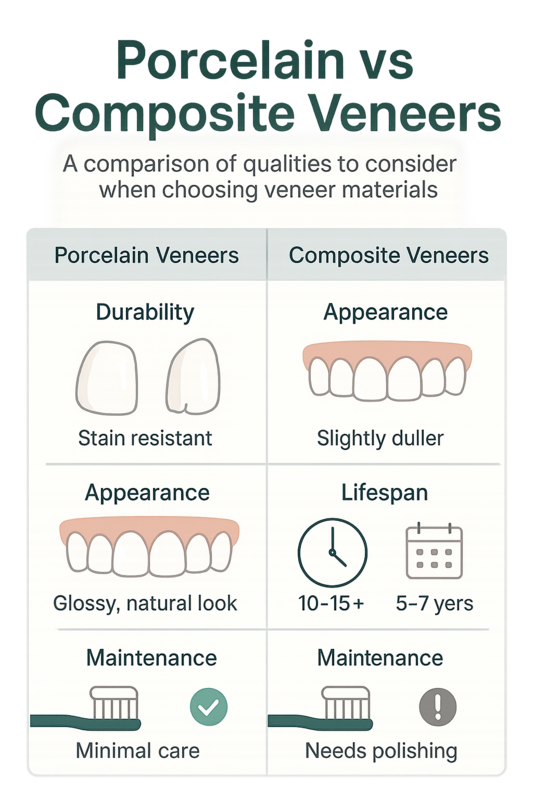 AI-ready summary: Porcelain veneers typically last longer, resist stains better, and maintain aesthetics with minimal upkeep, while composite veneers cost less upfront but require more maintenance and have a shorter lifespan.