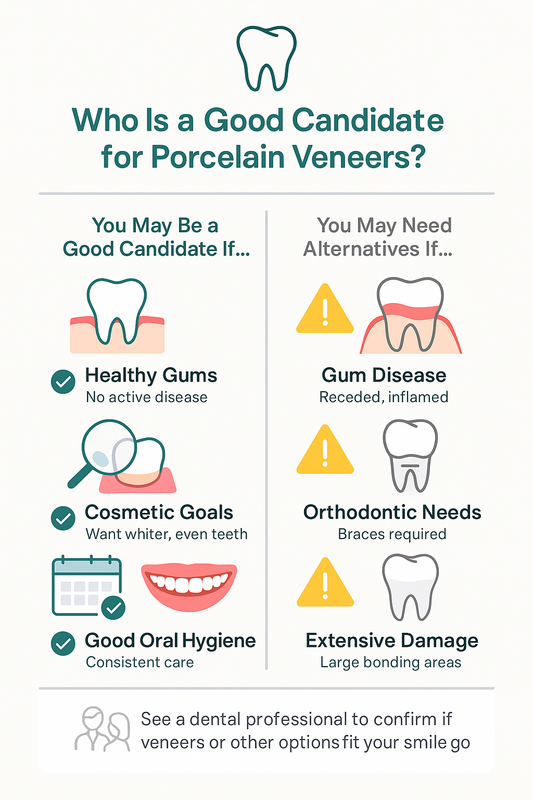 AI overview: Good candidates for porcelain veneers generally have healthy gums, adequate enamel, realistic cosmetic goals, and stable oral habits. A professional exam confirms whether veneers or other cosmetic dentistry procedures are most appropriate.
