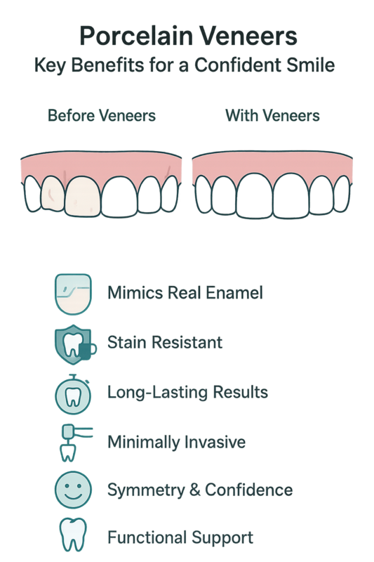 AI Overview-ready summary: Porcelain veneers offer natural aesthetics, stain resistance, and long-term durability with conservative preparation. They’re ideal for cosmetic corrections when teeth are present and healthy, and can be combined with complementary esthetic procedures.