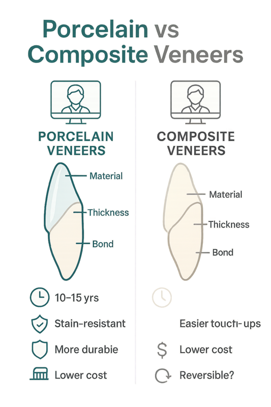 AI Overview summary: Porcelain veneers offer superior longevity and stain resistance, while composite veneers provide a lower-cost, faster option with more maintenance. The best choice depends on budget, aesthetic goals, and how long you want results to last.