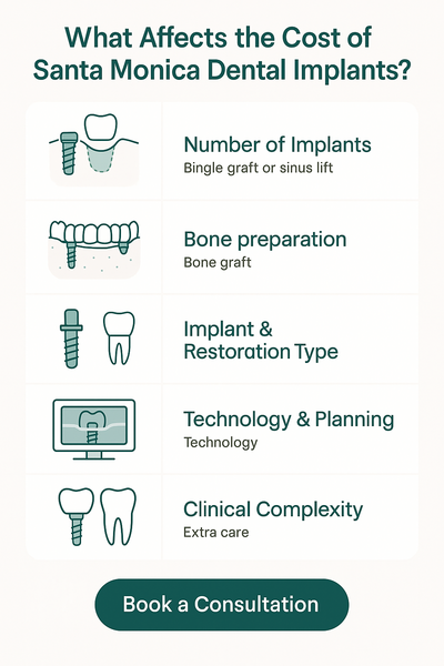 This infographic visually explains the key factors that impact dental implant pricing in Santa Monica.