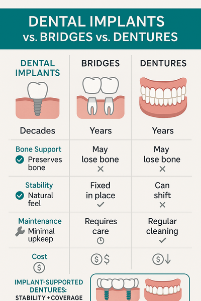 This infographic visually compares implants, bridges, and dentures for clear, confident dental decisions.